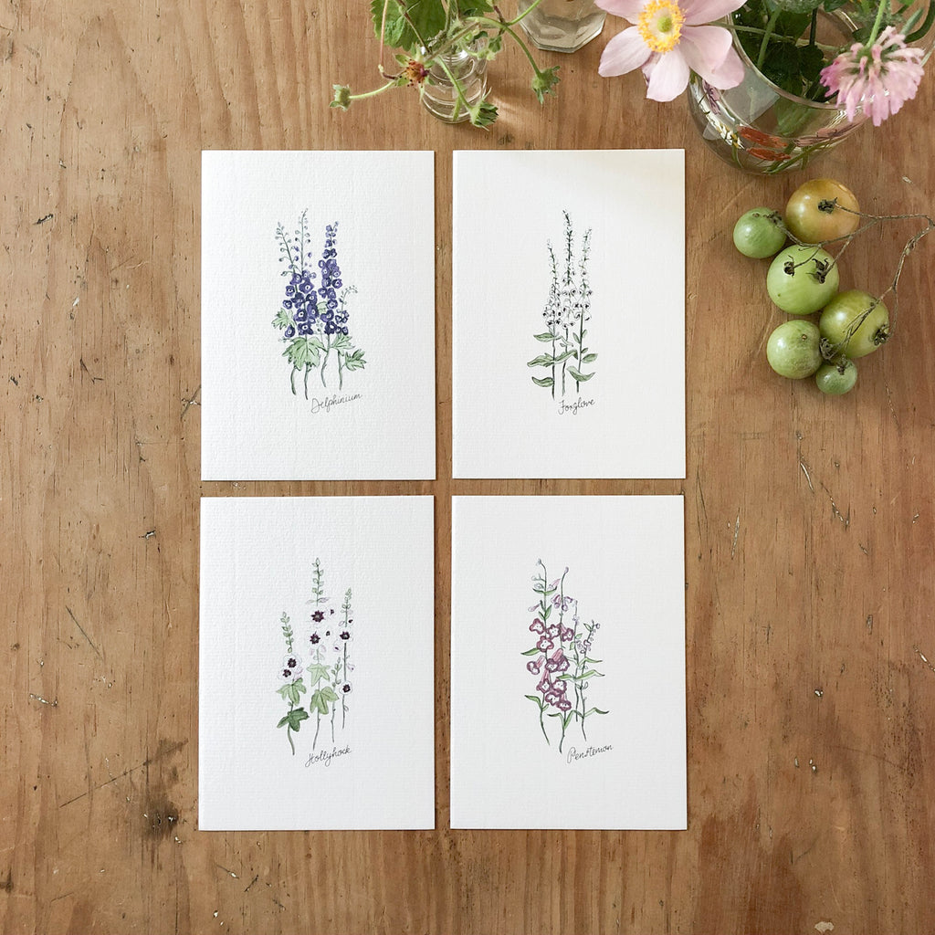 With hand illustrated Cottage Garden flowers: Delphinium, Foxglove, Hollyhock, Penstemon